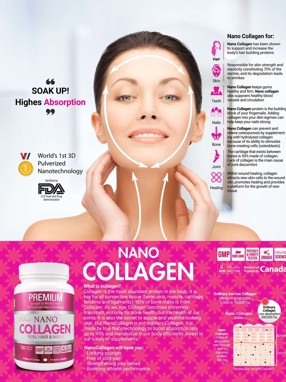 As collagen naturally decreases with age, this formula replenishes and stimulates collagen synthesis while enhancing hydration and elasticity in the skin and joints. With advanced nano-collagen technology, the ultra-fine molecules are absorbed quickly for maximum effectiveness.